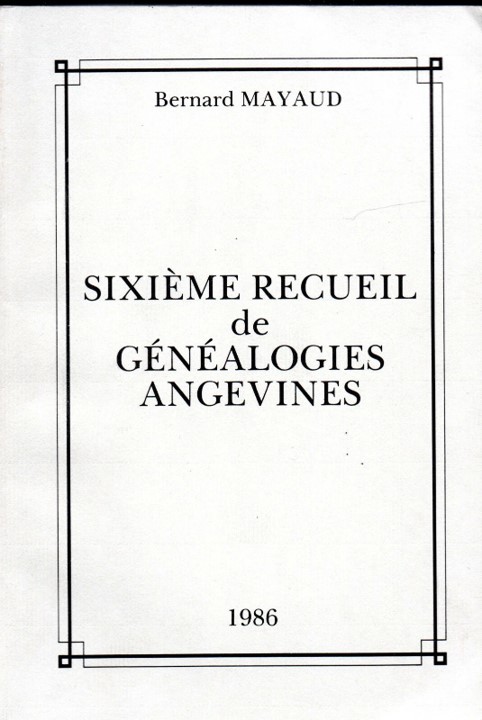 Chaque volume comporte une suite alphabétique propre. A partir du 2e volume, une table analytique des notices publiées figure jusqu’au volume concerné. Familles traitées dans ce « Sixième recueil des généalogies angevines » : AVRIL (à Angers, Saumur, Les Ponts-de-Cé, etc.) : 48 pages ; De BERNABÉ (de LA HAYE, de SAINT-GERVAIS) : 9 pages ; BLONDÉ (à Saumur, Bagneux, Bouillé-Loretz) (de MESSEMÉ) : 11 pages ; CONSTANTIN de LA LORIE (à La Chapelle-sur-Odon) : 12 pages ; De CUISSARD (à Saumur, Vernantes) (du PIN, de MAREIL) : 10 pages ; CUPIF (Angers, La Bérausière, La Robinaie, Teildras) : 16 pages ; De CYRET (à Saumur, Gennes, Vivy) (de BRON) : 6 pages ; DUTERTRE (à Saumur, Chénehutte) (des ROCHES) : 17 pages ; Du VAU de CHAVAGNES (à Gennes) (de MILLÉ-BRETESCHE) : 13 pages ; Du VERDIER de LA SORINIÈRE (à Chemillé) : 15 pages ; ERNAULT de MOULINS (à Livré, Contigné, Miré) : 11 pages ; De GHAISNE de BOURMONT (à Sillé-le-Guillaume, à Freigné) : 8 pages ; (de) GUÉNYVEAU (de LA FROGERIE, LA LOUETTIÈRE, LA RAYE) : 26 pages ; JOUBERT (à Doué, Saumur, Montreuil-Bellay) : 8 pages ; De LA FOREST d’ARMAILLÉ (à Angers, Craon) : 17 pages ; LE PELETIER (à Saint-Denis d’Anjou) : 12 pages LOIR-MONGAZON (à Saumur) : 13 pages ; PERSAC (à Saumur) (d BEAUREGARD) : 6 pages ; De RACAPÉ (à Mesnil) (de MAGNANNE) : 13 pages ; SAILLAND (à Douces, Doué, Saumur, Les Ulmes, etc.) : 31 pages.